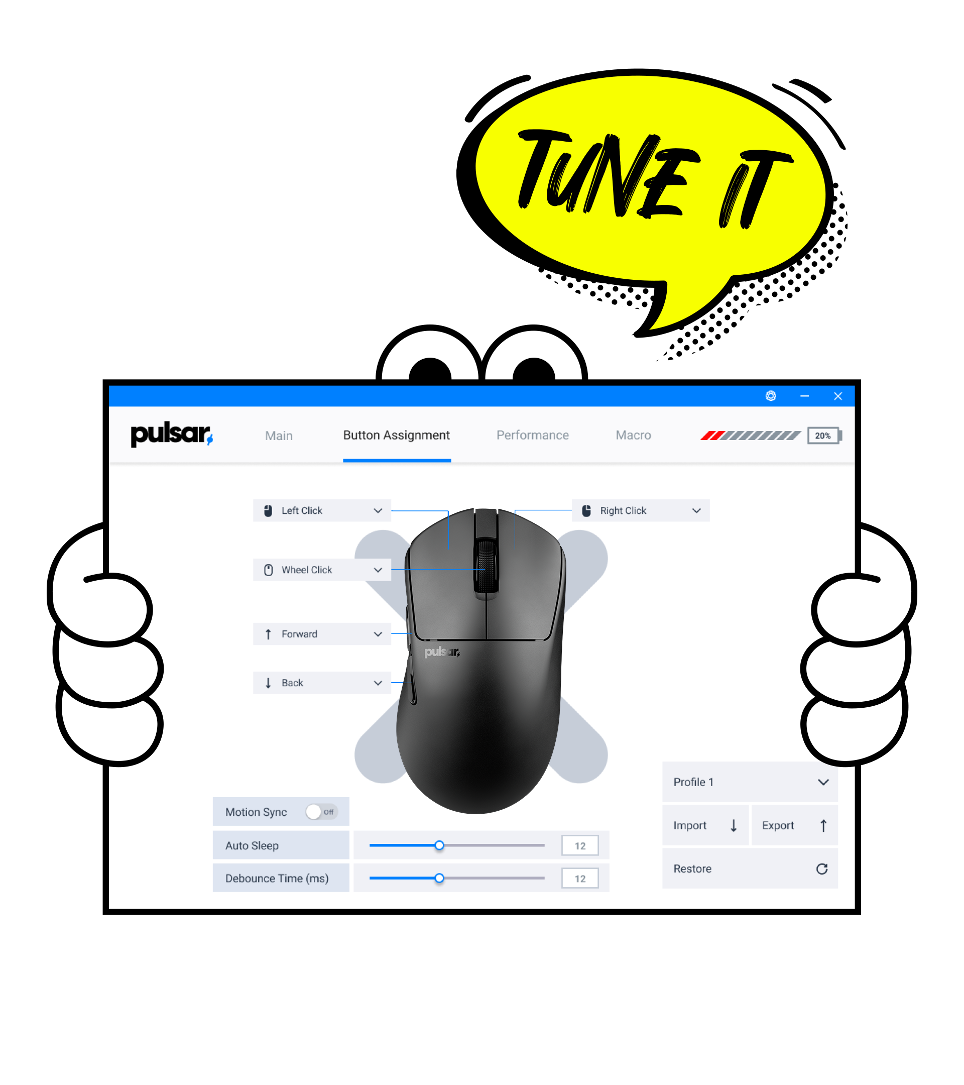 Pixartのフラッグシップセンサーは99.6%の解像度精度を誇りますが、Motion-Syncテクノロジーによってトラッキング精度がさらに向上しています。このテクノロジーは、センサーの信号とPCのデータ抽出を同期させ、最小限の遅延(1ミリ秒未満)でトラッキング精度を向上させます。この機能は、Pulsar Fusionソフトウェアでオン/オフを切り替えることができます。
